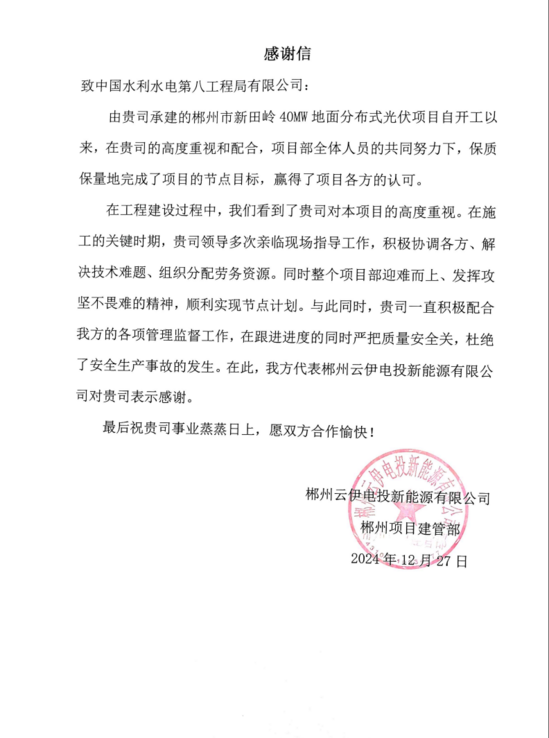 郴州光伏項目收到業(yè)主方感謝信 | |||||