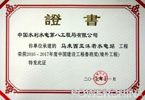 馬來(lái)西亞沐若水電站榮獲2016-2017年度魯班獎(jiǎng)