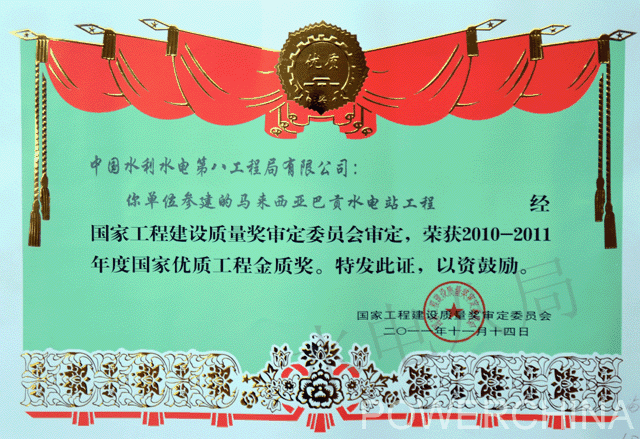 2011年11月,由水電八局參建的馬來西亞巴貢水電站工程榮獲2010-2011年度國家優(yōu)質(zhì)工程金質(zhì)獎。{(工質(zhì)字[2011]15號)《關于表彰2010-2011年度國家優(yōu)質(zhì)工程獎(海外)》}